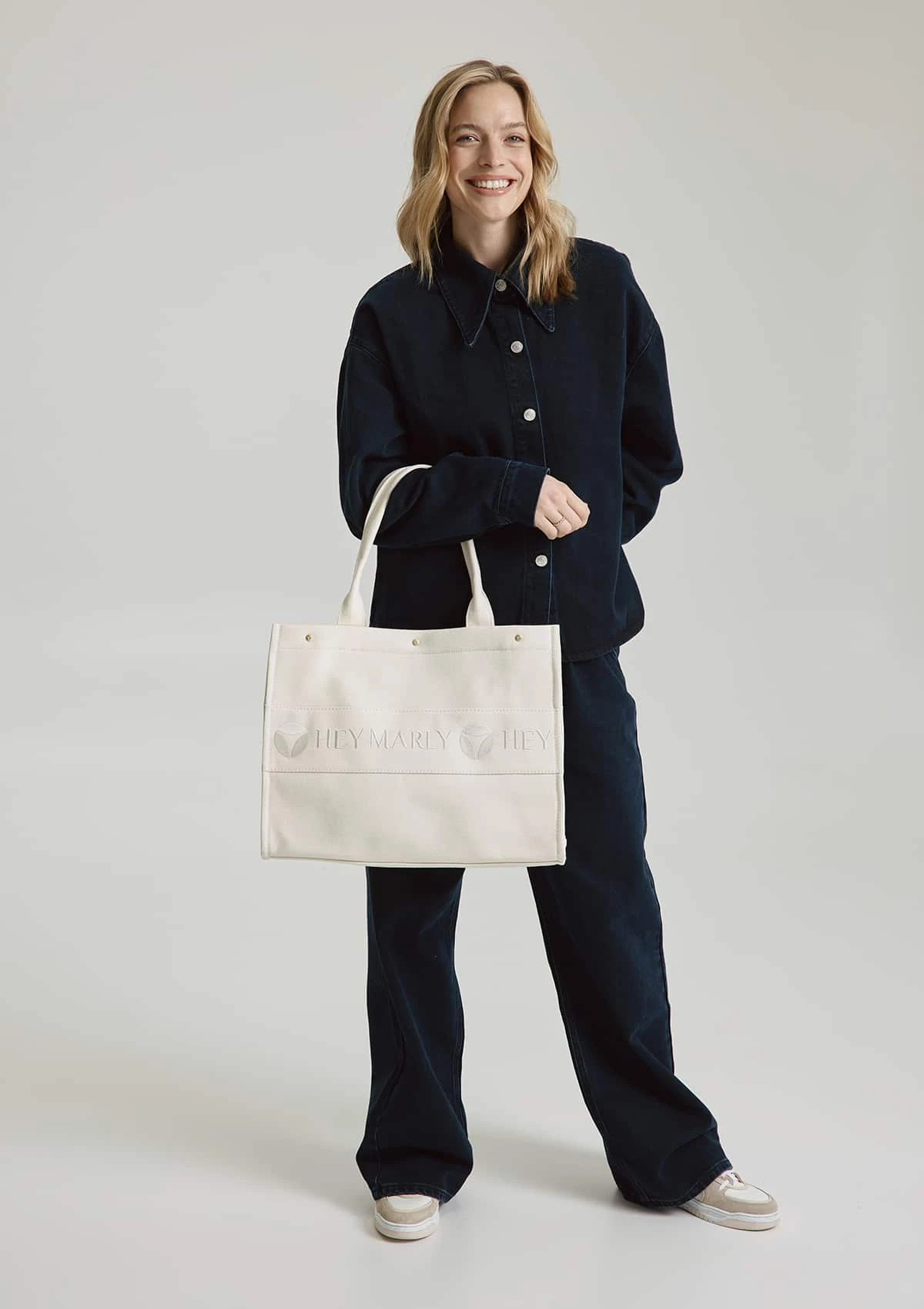 Gefertigt aus wasserabweisendem Canvas, ist sie nicht nur langlebig, sondern auch ein echter Blickfang. Der eingestickte „HEY MARLY“ Schriftzug auf beiden Seiten verleiht ihr eine persoenliche Note. Im Inneren sorgen kleine Verstaumoeglichkeiten fuer Smartphone oder Geldbeutel dafuer, dass du alles geordnet und griffbereit hast.